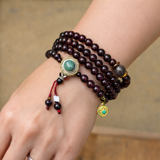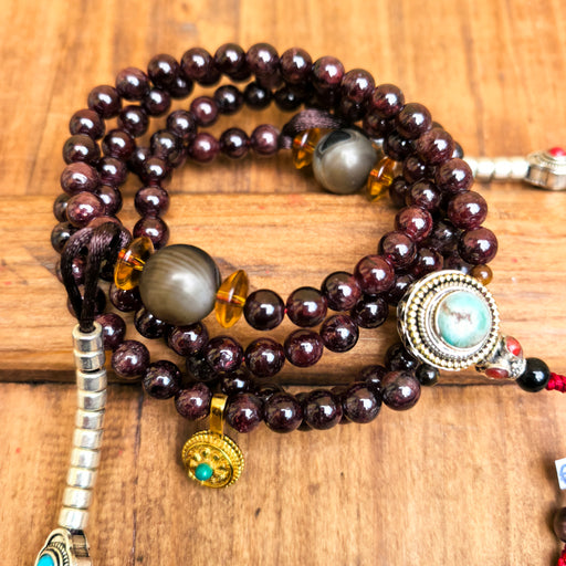 Mala Tibetano 108 Grani – Granato Almandino con Dzi Agata e Guru in ArgentoQuesto mala tibetano tradizionale è composto da 108 grani di granato alm...