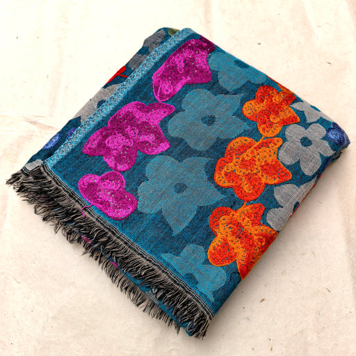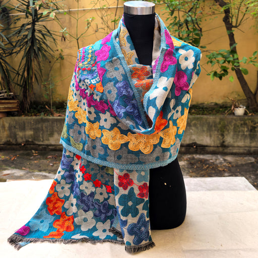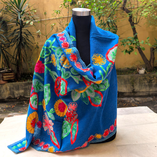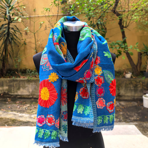 Sciarpa realizzata a mano in 100% lana con ricamo in rilievo di seta e frange sui lati opposti.Disegno floreale dai colori vivaci su base blu.Misur...