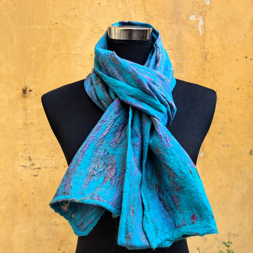 Sciarpa in feltro verde con pizzo Saree – Una delicata fusione di sari vintage e morbida lana infeltrita, realizzata a mano in un blu per un access...