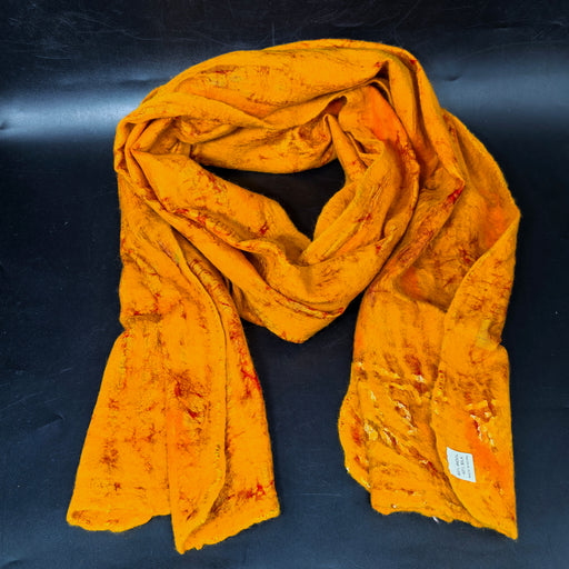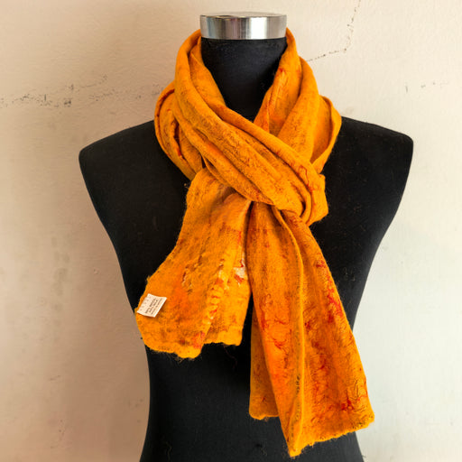 Sciarpa in feltro verde con pizzo Saree – Una delicata fusione di sari vintage e morbida lana infeltrita, realizzata a mano in un arancione intenso...