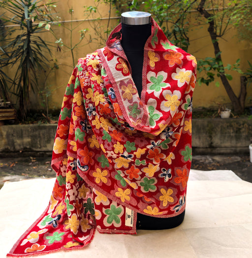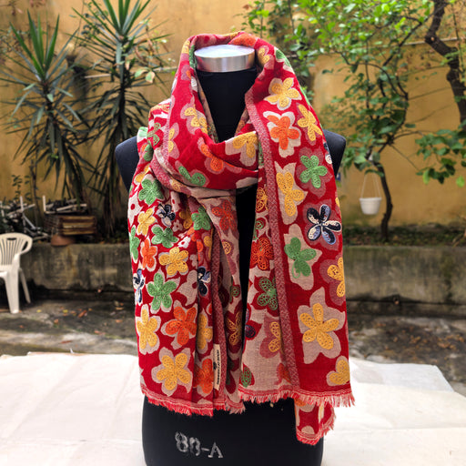 Sciarpa realizzata a mano in 100% lana con ricamo in rilievo di seta e frange sui lati opposti.Disegno floreale dai colori vivaci su base rosso.Mis...