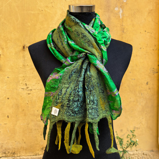 Sciarpa in feltro verde con pizzo Saree – Una delicata fusione di sari vintage e morbida lana infeltrita, realizzata a mano in un verde intenso per...