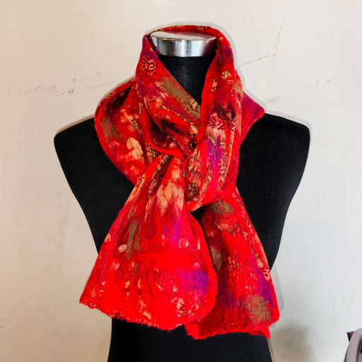 Sciarpa in feltro verde con pizzo Saree – Una delicata fusione di sari vintage e morbida lana infeltrita, realizzata a mano in un rosso intenso per...