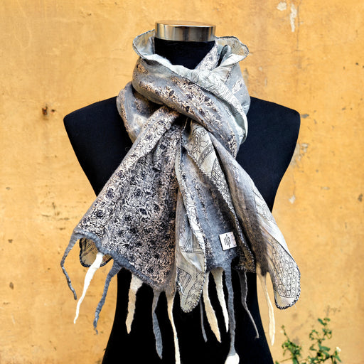 Sciarpa in feltro verde con pizzo Saree – Una delicata fusione di sari vintage e morbida lana infeltrita, realizzata a mano in un griggio per un ac...