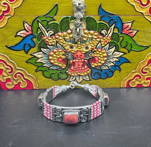 Braccialetto tibetano fatto mano in Nepal con argento 925 , Turchese e Corallo misura 6.5