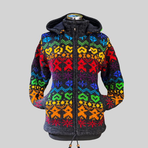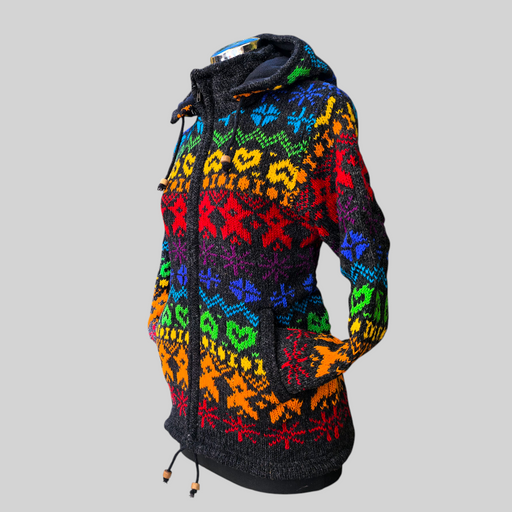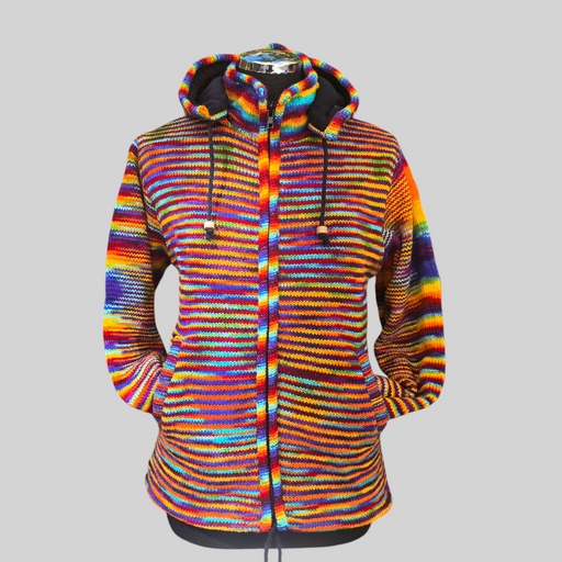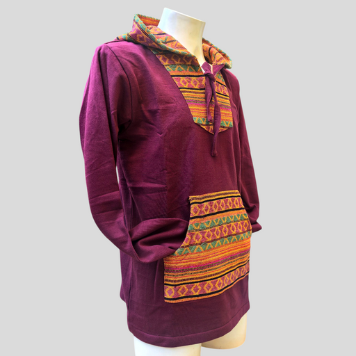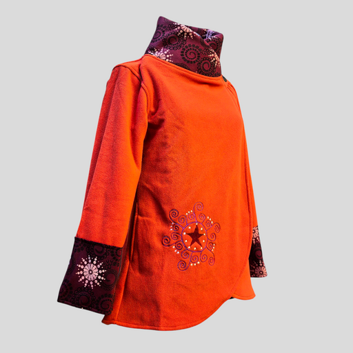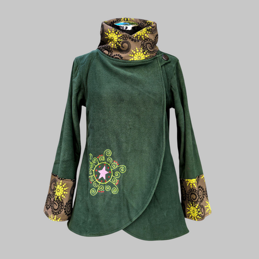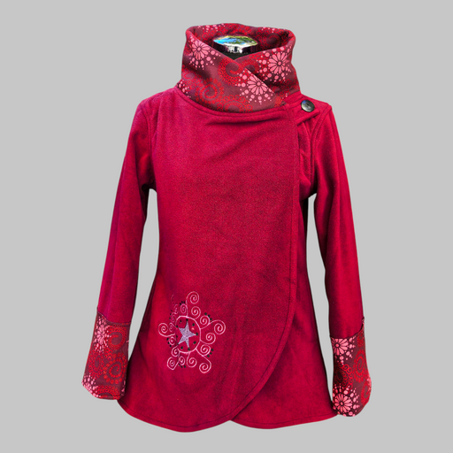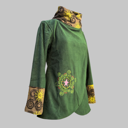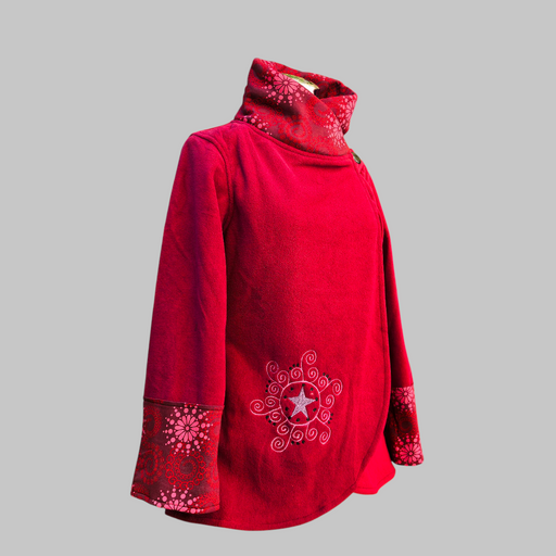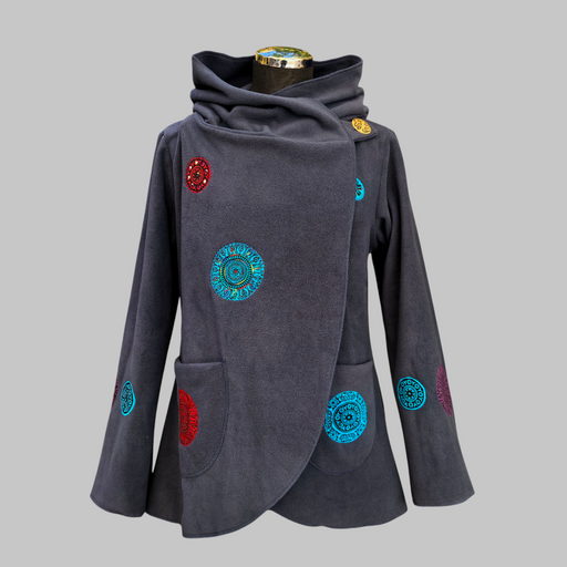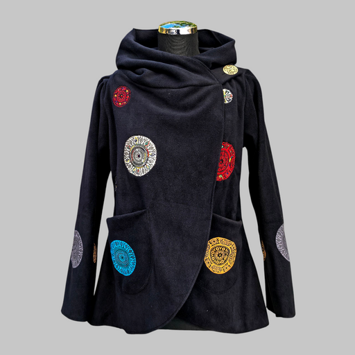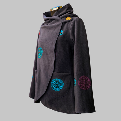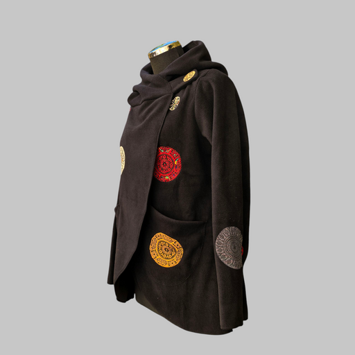 Una giacca in pile ricamato mandala, morbido e caldo con cappuccio e tasche laterali. Il cappuccio è foderato in morbido cotone stampato, che aggiu...