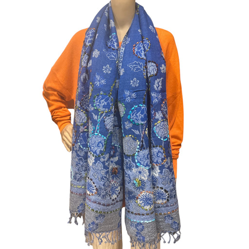Sciarpa realizzata a mano in 100% lana con ricamo in rilievo di seta e frange sui lati opposti. Disegno floreale dai colori vivaci su base blu. Mis...