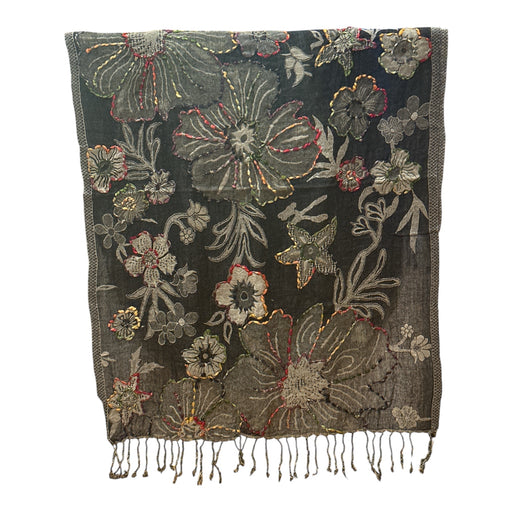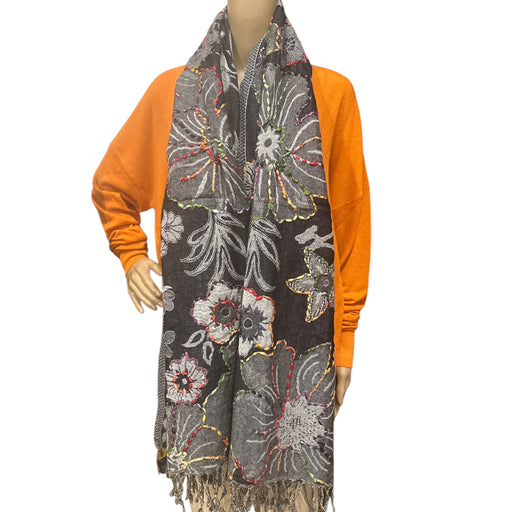 Sciarpa realizzata a mano in 100% lana con ricamo in rilievo di seta e frange sui lati opposti.Disegno floreale dai colori vivaci su base nera. Mis...