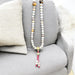 Questo mala è fatto di opale bianco e occhio di tigre, che sono anche dei minerali molto portafortuna. In particolare, abbiamo inserito un guru con forma di lotto molto speciale con argento indiano placcata in color oro e Ona perlina con la scritta om mani pedme hum in lingua tibetana.