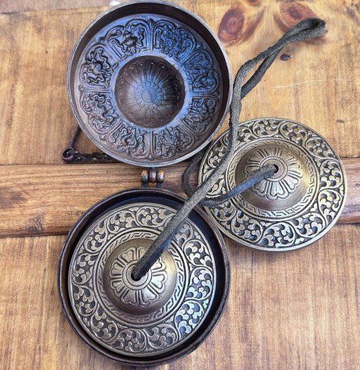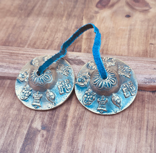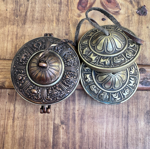 Le Cimbali Antiche Tibetani sono strumenti rituali unici, intagliati e decorati con 8 simboli di buon auspicio Tashi Darghal, veri portafortuna nel...