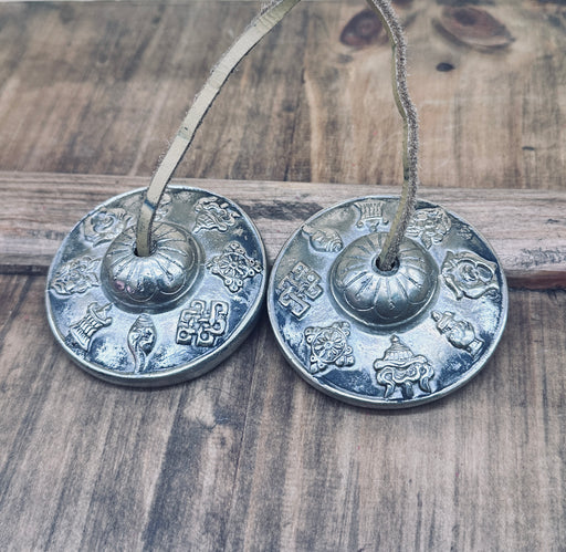 Cimbali Tibetani con 8 Simboli di Buon Auspicio – Diametro 7 cm, fatti a mano in Nepal con una speciale lega di 7 metalli. Strument...