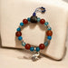 Si tratta di un braccialetto elastico fatto a mano con perle di agata di fuoco lucidata e acquamarina, con un ciondolo a forma di elefante in argento e perline decorative tibetane.