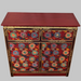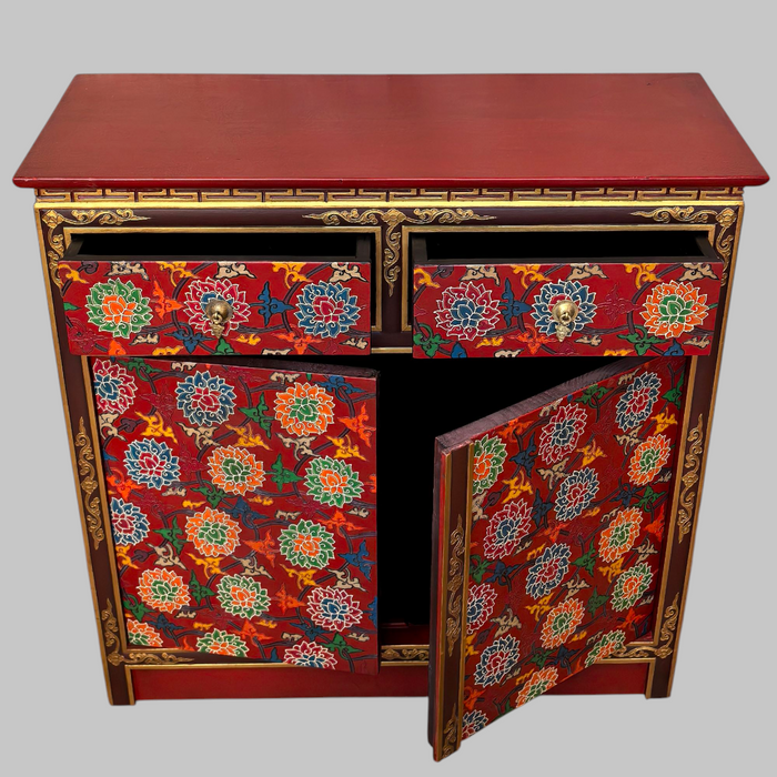 Impreziosito da motivi tradizionali tibetani, disegni vivaci e ornati toni del rosso e dell'oro, questo mobiletto porta calore, cultura e un senso di sacra eleganza in qualsiasi ambiente. Perfetto per soggiorni, sale di meditazione o come originale mobiletto per altare.